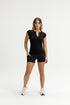 The Benne Tee is crafted from a ribbed polyester-elastane blend, offering both stretch and comfort. In classic Black, this slim-fitting henley-style top features gold domes at the chest for a stylish touch.