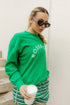 This classic crew will quickly become your new wardrobe staple. It features a ribbed V-neckline, along with ribbed cuffs and hem for a refined finish. In our signature color of the season, Kelly Green, it’s adorned with a striking Rose Road Arch print on the front for a pop of personality. Perfect for easy, everyday wear with a touch of standout style.
